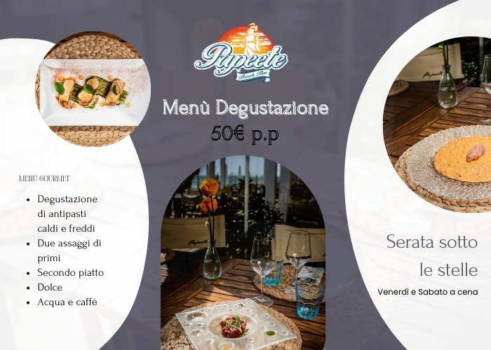 Il Papeete ti invita a vivere un’esperienza culinaria d’eccellenza con il nostro esclusivo Menù Degustazione, pensato per condurti in un viaggio sensoriale attraverso i sapori autentici della cucina mediterranea.